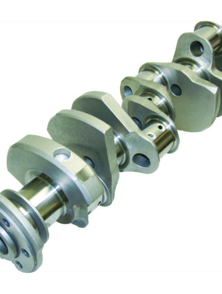 Forged SAE 4340 steel with non-twist forging and multi-stage heat-treatment gun drilled mains; Lightweight counterweight design. Micropolished journals feature a 3 r.a. or better; .125″ radiuses improve strength and rigidity; Chamfered or narrowed bearings required; Shot-peened, stress relieved, and nitrided for superior durability; Designed for internal balance without the need for heavy metal; Recommended for use in naturally aspirated competition engines; Approximate weight is 47-49 pounds before balancing.
