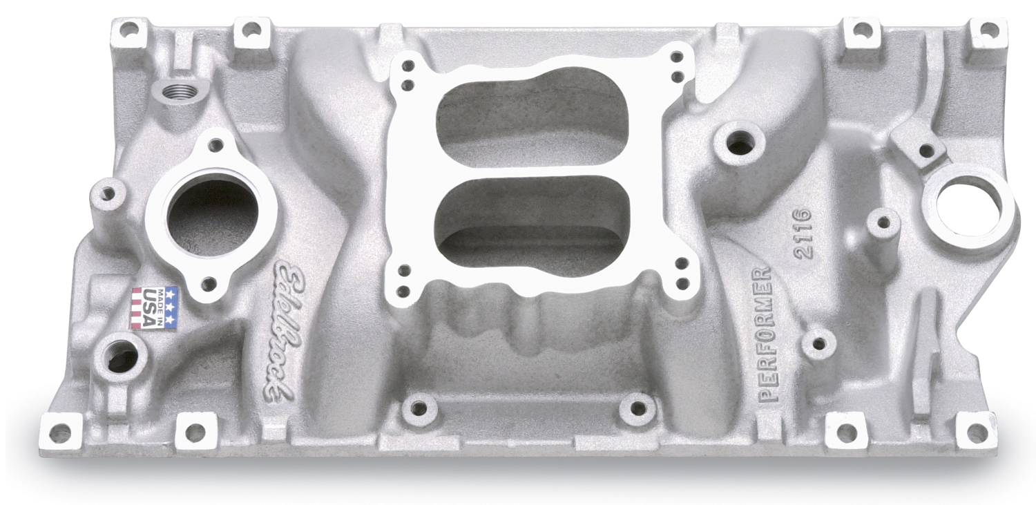 Based on the powerful Edelbrock #2101, this dual-plane intake is designed for the street rod, industrial and engine swap market utilizing 262-400 c.i.d. Chevy V8’s with 1996 and later Vortec (L31) cast iron or the Edelbrock E-Tec aluminum heads. Manifold has provisions for external water bypass and may be used on either Vortec blocks or 1995 and earlier blocks. No provision for exhaust heated chokes. Accepts both square-bore and spread-bore carbs and late model water neck, alternator, HEI and air conditioning brackets. Will not fit under stock Corvette hood. Available with standard, black or EnduraShine finish for a look you’ve got to see to believe. For high performance engines operating from 1500-6500 RPM, see the Performer RPM Vortec manifold.